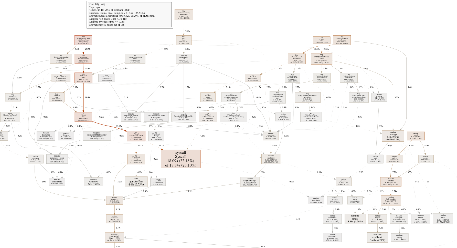 OK, that's mostly what you'd expect from a large well-optimized program, a wide callgraph with not that many obvious places to sink our effort into. The big red box is the syscall leaf, a function we're unlikely to optimize.