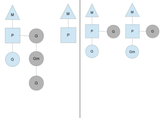 Here we see 2 threads (M), each holding a context (P), each running a goroutine (G). In order to run goroutines, a thread must hold a context.